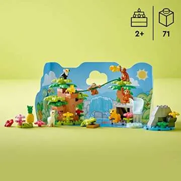 Show more Introduce your little ones to the wild wonders of South America with the LEGO DUPLO Wild Animals of South America 10973 Educational Set. This delightful collection is specifically designed for toddlers aged 2 and above, combining playful adventure with educational value. With a vibrant 3-dimensional jungle playmat as the backdrop, children will explore a lively environment filled with 7 adorable animal figures including a crocodile, two playful monkeys, a sloth, a baby jaguar, a colorful toucan, and an alpaca. The set not only promises endless fun but also fosters imagination and creativity, making playtime a rich, engaging experience.