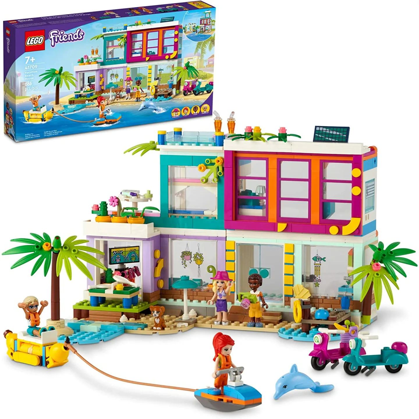 The set includes LEGO Friends Mia and other mini-doll figures, along with dolphin and cat figures.