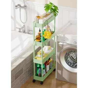 Show moreIntroducing the LEHOM 5.3" Slim Storage Cart, the perfect blend of style and functionality that brings order to even the tightest spaces in your home. With its sleek width of just 5.3 inches, this 4-tier mobil shelving unit is designed to fit effortlessly into various environments, from your kitchen and bathroom to your laundry room and office. Boasting a refreshing green finish, this cart not only serves as an effective space saver but also adds a pop of color to your décor.
