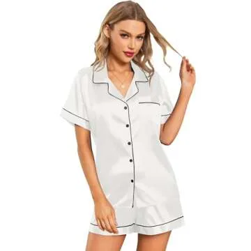 Leikar Womens Silk Satin Pajamas Shorts Set Bride Pajamas Button Down Pjs Sleepwear XXL White