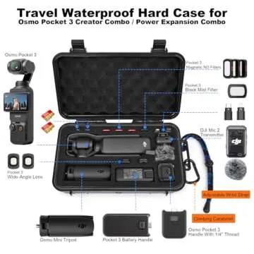 Show more The Lekufee Waterproof Hard Case for the DJI Osmo Pocket 3 exemplifies innovation in protective gear, meticulously crafted for adventurers and creators alike. With its robust yet lightweight design, this case safeguards your invaluable camera and accessories from the rigors of outdoor exploration. Its IP67 waterproof and dustproof ratings ensure that your gear stays dry and safe, whether you're hiking through rain-soaked trails or filming near water. The impact-resistant ABS plastic shell, combined with a shock-absorbing elastic sponge interior, provides a fortress of protection against drops and shocks, keeping your Osmo Pocket 3 secure in the harshest environmental conditions.