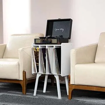 LELELINKY Small Record Player Stand - Width 11.7 In, White Vinyl Record Storage Table with 4 Cabinet Up to 80 Albums, Vinyl Holder with Wood Legs,Turntable Stand Display Shelf for Bedroom Living Room