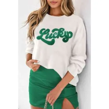 LEMAFER Women's 2025 St. Patrick's Day Sweater Green Sequin Lucky Letter Round Neck Casual Long Sleeve Sweatshirt Pullover Tops