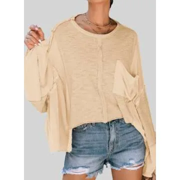 LEMAFER Women's Exposed Seam Chest Pocket Loose Sleeve Oversized Tunic Top Casual Round Neck Solid Patchwork Long Sleeve Blouse