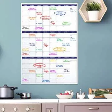 Show more Introducing the Lemome Home Large Dry Erase Calendar for Wall, an indispensable tool for anyone looking to organize their life efficiently. Measuring an expansive 28" x 41", this undated wall calendar extends over three months, allowing you to plan your schedule without the constraints of pre-dated entries. Its sleek dark gray and white design not only fits seamlessly in any decor but also provides a visually appealing way to keep track of your appointments, tasks, and reminders. Each calendar is crafted with a unique layered poster laminated coating that ensures durability, making it completely stain-proof and ghost-free for effortless cleaning.