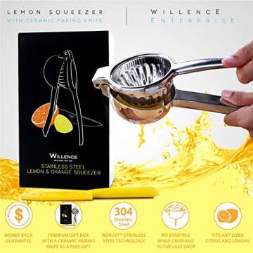 Lemon Squeezer Press Superior Quality Manual Citrus Orange Juicer W/Free Ceramic Knife. 304 Grade Stainless Steel In Premium Gift Box By Willence