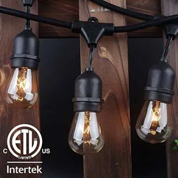 Lemontec Commercial Grade Outdoor String Lights with 15 Hanging Sockets - 48 Ft Black Weatherproof Cord Weatherproof Strand for Patio Garden Porch Backyard Party Deck Yard – S14 Black