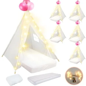 The package includes 6 teepee tents, inflatable mattresses, fitted sheets, and star string lights.