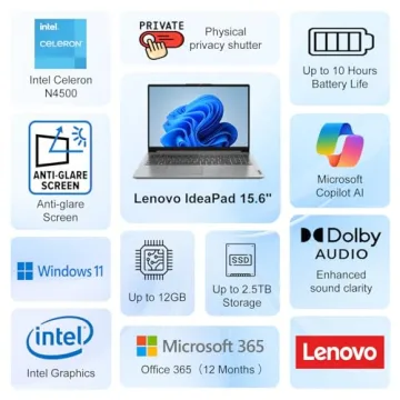 Show moreIntroducing the Lenovo Ideapad 15.6" Laptop, a perfect blend of style, performance, and convenience designed for modern users who demand both functionality and portability. With a generous 15.6-inch HD anti-glare display, enjoy an expansive viewing experience that enhances your productivity at work, supports your studies, or elevates your entertainment sessions. Weighing in at just 3.52 lbs, this slim laptop proves that you don't have to compromise on screen size for portability; it's ideal for users on the go, whether commuting to work or studying at the local café.