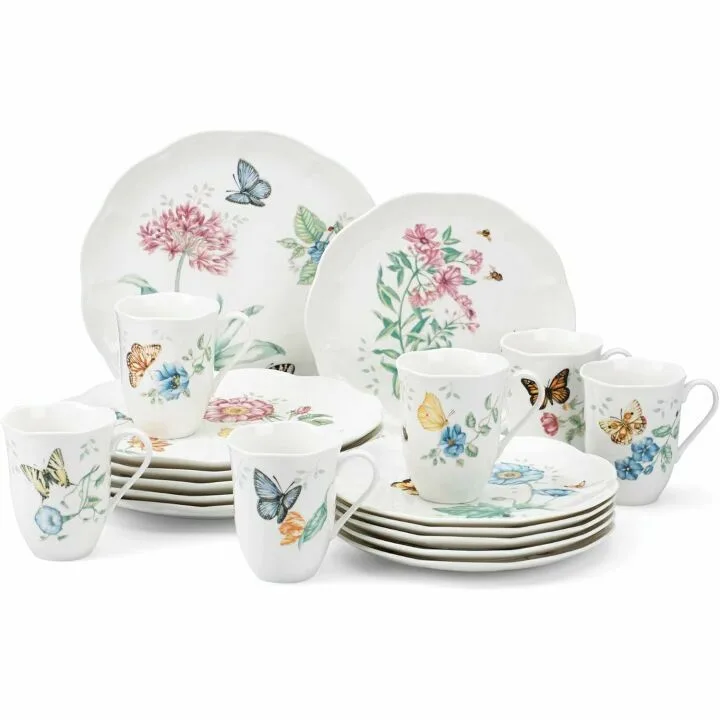 The Lenox Butterfly Meadow 18-Piece Dinnerware Set includes six dinner plates, six salad plates, and six mugs. Each piece is adorned with beautifully detailed butterfly and floral illustrations, adding a touch of nature to your dining table. The set is crafted from high-quality porcelain, ensuring durability and long-lasting beauty. It is dishwasher and microwave-safe, providing both convenience and practicality. The charming design makes this set not only functional but also a delightful addition to any home.