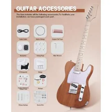 When compared to other DIY electric guitar kits on the market, the Leo Jaymz DIY TL Style Electric Guitar Kit stands out due to its use of premium materials such as solid mahogany and maple. Many competitors tend to use cheaper woods like Paulownia, compromising on sound quality. Furthermore, the comprehensive instructions and plug-and-play wiring make it easier to assemble than many competing products, enhancing user experience. This kit also includes unique features such as the security strap locks and copper foil for noise reduction that are often overlooked in other kits.