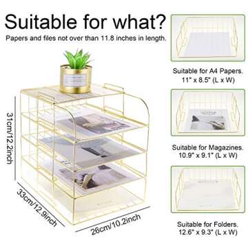 Show moreIntroducing the LEORISO 4-Tier Stackable Letter Tray – a perfect blend of elegance and functionality designed to elevate your workspace! With its modern design featuring a stunning gold finish and an innovative vertical layout (10.2x12.9x12.2 inches), this letter tray not only organizes your documents but also enhances your desk's aesthetic appeal. Crafted from high-quality iron wire with meticulous welding, it promises durability without compromising on style. The upper display shelf is ideal for showcasing small plants, decorative items, or essential desk accessories such as staplers and calculators, making it a truly multifunctional piece.