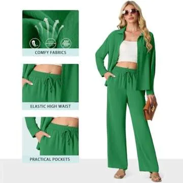 The shirt comes with a convenient **button-down** design and **long sleeves**, making it an excellent layering piece for various occasions. The **elastic high waist** pant ensures a comfortable fit while the **deep pockets** on both sides are practical enough to hold your essentials like your phone, wallet, and keys, all while keeping the outfit stylishly chic.