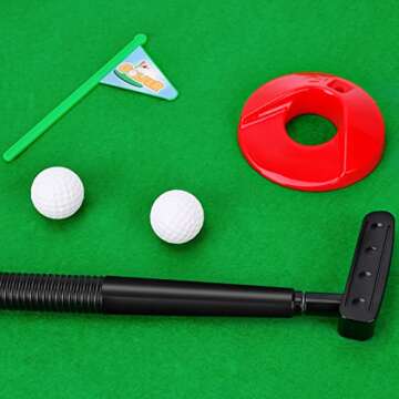 Show moreIntroducing the Lerturdy Funny Gag Mini Golf Toy, a hilarious way to enjoy the great game of golf while bringing a smile to your face! This compact golf set has been meticulously crafted to include everything you need for a mini golfing experience right at home or even in the office. Each set comes complete with a 1 putter, 2 golf balls, 1 golf hole with flag, 1 door hanger, and a functional putting green. No more endless waiting on the green; take it at your own pace and have fun anywhere you go!