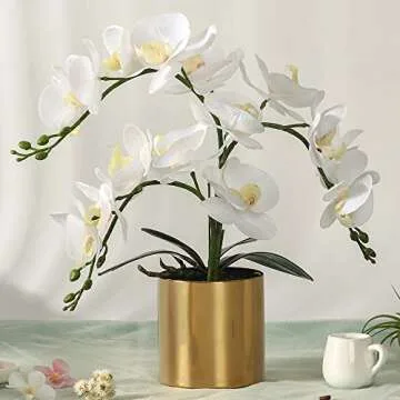 LESING Artificial Orchid Flower with Vase, White Orchid Bonsai Faux Orchid Phalaenopsis Plant Pot Arrangements for Home Decoration (White,Gold Vase)