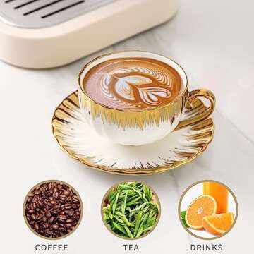 Introducing the LETAOTAO Cappuccino Cups with Saucers – a luxurious addition to your coffee and tea experience. This exquisite set includes 6 beautifully crafted porcelain cups, each with a capacity of 7 oz (180ml), along with their matching saucers measuring 5.6 inches in diameter. The elegant design highlights a stunning white glaze finished with a gleaming gold trim, making it a perfect centerpiece for any afternoon tea gathering with family and friends....