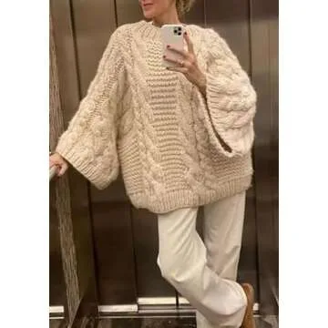 LETSVDO Women's Oversized Cable Knit Sweater Long Sleeve Crewneck Baggy Slouchy Chunky Pullover Sweaters Beige