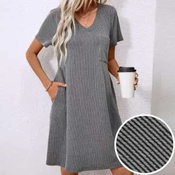levaca Summer V Neck Ribbed Tshirt Dress for Women 2024 Loose Casual Dresses with Pocket Black S