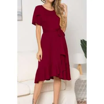 levaca Women Plain Casual Swing Ruffle Midi Dress with Belt Wine S