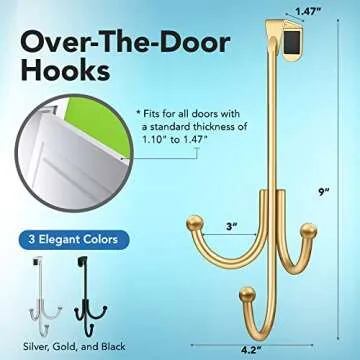 Show more Introducing the ultimate solution for organized living: our SPACIOUS OVER THE DOOR HOOKS that combine practicality and elegance! Crafted from high-strength zinc alloy, these hooks can support up to 20 pounds each, making them perfect for hanging robes, towels, coats, bags, and more. Say goodbye to clutter and hello to efficiency! The versatile design features three heads that can be mounted on doors with a thickness of up to 1.47 inches, accompanied by multiple sponge pads that ensure a snug fit, keeping your hooks securely in place without damaging your doors.
