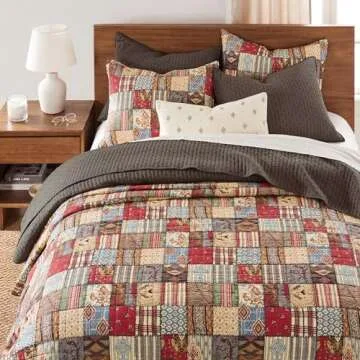 Show more Introducing the Cross Stitch Cocoa Quilt Set, an exquisite bedding essential that merges comfort with timeless design. Inspired by intricate hand stitching techniques, this quilt features a beautiful cocoa cross stitch pattern, accented by a charming reverse pattern that adds depth and versatility to your bedroom decor. Crafted with love by Levtex Home, this set includes a generously sized quilt (106x92 in.) and unique matching pillow shams that are randomly cut from the same fabric, ensuring no two shams are alike.