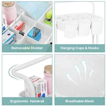 Show more This versatile 3-tier rolling utility cart is your ultimate storage solution! Designed with both form and function in mind, this cart offers a large storage capacity featuring 3 hanging cups, 4 hooks, and 5 dividers, keeping your space organized and clutter-free. The sleek design makes it perfect for small areas such as kitchens, craft corners, or even as a beautiful display for your salon products. Its sturdy and stable construction ensures it can hold up to 66lbs while remaining easy to move while you organize. Crafted with a high-quality steel frame and durable ABS mesh baskets, your contents will be safe from spills and scratches, thanks to its waterproof and scratch-resistant properties.