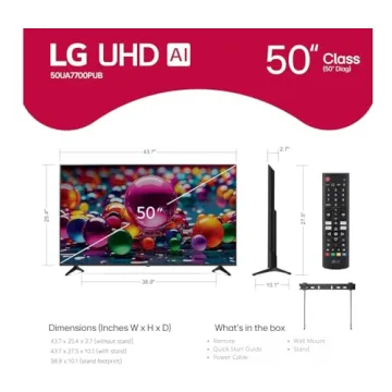 Show moreExperience the future of home entertainment with the LG 50" UHD AI UA75 Smart TV, a stunning 2025 model that redefines clarity and detail in every viewing. Equipped with the advanced a7 AI Gen8 Processor, this TV enhances your content, providing remarkable 4K upscaling that revitalizes even lower-resolution sources. Ideal for those who value both performance and quality, this model ensures that every frame delivers immersive visuals and vibrant colors.