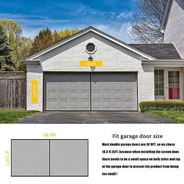 Show more Transform your garage into an inviting extra living space with the MAGNETIC SCREEN MESH DOOR by LIAMST. Measuring a generous 16.3 x 8.15 feet, this innovative mesh screen is designed to fit various types of entries, including front and rear doors, terraces, porches, and balconies. The installation is a breeze with the included full frame Magic Tape, ensuring a secure and functional attach point. Designed to let fresh air flow unobstructedly, the screen features a strategically placed middle seam lined with strong magnets that not only provide an excellent seal but also allow for easy access. Whether you have kids, pets, or just love the outdoors, this screen allows for smooth in-and-out transitions while keeping the bugs safely outside.