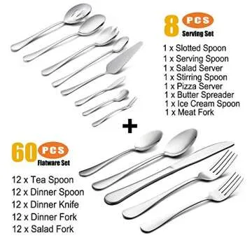 Show more Experience the perfect blend of functionality and elegance with the LIANYU 68-Piece Flatware Silverware Set. Designed to serve 12, this comprehensive set includes 12 each of butter knives, dinner forks, dinner spoons, salad forks, and tea spoons, along with essential serving utensils such as serving spoons, slotted spoon, pizza server, salad server, butter spreader, stirring spoon, ice cream spoon, and a meat fork. Expertly crafted from high-quality pure stainless steel, this flatware set ensures durability and rust resistance, promising to be a reliable companion for your dining experiences for many years to come.