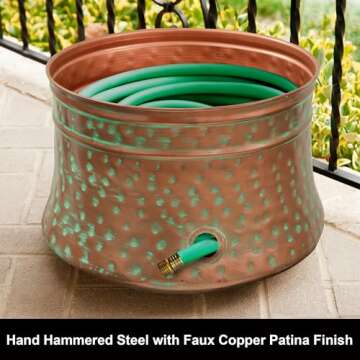 Show moreThe Liberty Garden 1917-G Hose Pot is the epitome of elegance and functionality, specially crafted to elevate your outdoor decor while keeping your garden organized. Designed to accommodate up to 100 feet of standard 5/8” garden hose (hose not included), this exquisite storage solution features a durable hand-hammered steel construction that promises years of reliable use. Not only does this hose pot serve as a practical tool, but it also adds a touch of charm with its beautiful hand-painted faux patina copper finish, ensuring your garden looks exquisite and polished. The unique design includes an inlet port to connect your garden hose directly to your water supply, making watering your garden a breeze. Furthermore, its innovative drainage system prevents standing water in the basin, ensuring that your storage area remains clean and dry.