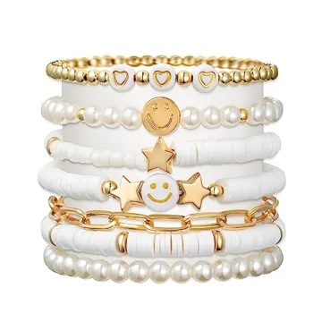 Show moreIntroducing the exquisite collection of White Gold Preppy Bracelets, a stunning set of seven unique pieces designed to elevate your accessory game. This stylish ensemble features a mix of white gold Heishi bracelets, showcasing various charming elements such as golden beads, white vinyl clay, smiles, stars, hearts, and artificial pearls. Each bracelet tells a story of creativity and individuality, making them not just mere accessories but expressive pieces of art. Crafted with care, these bracelets have been designed to suit a wide range of personal styles, ensuring that they not only look great but also feel comfortable to wear.