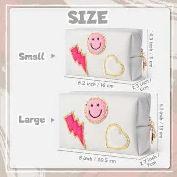 LieToi Preppy Patch Cosmetic Toiletry Bag, PU Leather Portable Waterproof Makeup Bag Smile Lightning Heart Organizer Compliant Bag Daily Travel Use Storage Purse for Women Girls (Large, White)