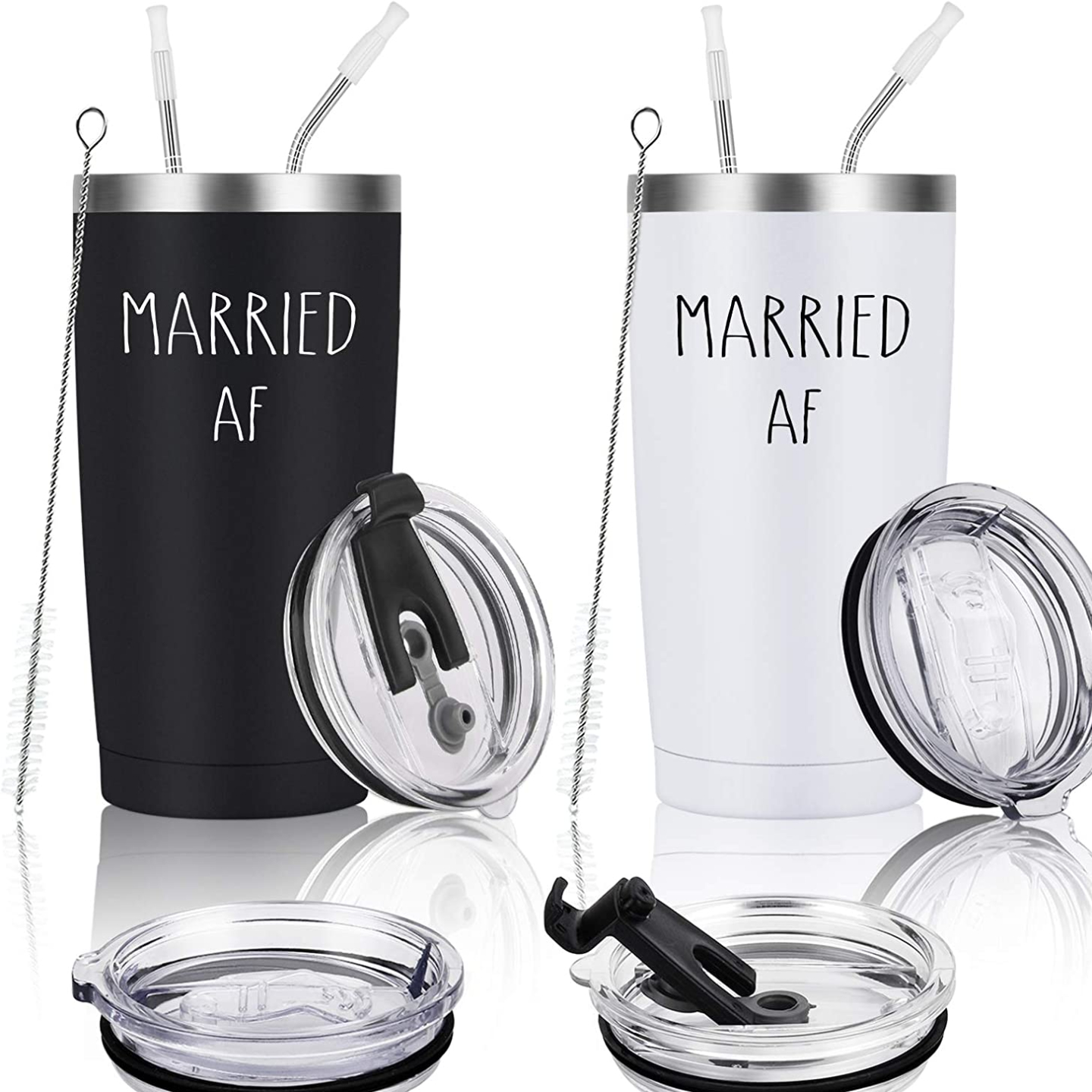 Whatever the celebration, this gift set is sure to invoke smiles and create memorable moments. The advanced double wall vacuum insulation keeps beverages hot for over 5 hours and cold for more than 9 hours. BPA-free lids enhance safety and maintain the temperature. Sleek, sweat-proof design ensures comfort while holding. Multi-functional use across a broad range of beverages. Unlike many other tumblers, the 'MARRIED AF' set boasts superior insulation technology and a robust, non-fading construction that ensures your lettering stays put, no matter the number of uses. This guarantees that the tumblers outlast their competitors, providing sustainability and durability that's both economical and environmentally friendly. The exclusive 'MARRIED AF' travel tumblers not only serve a functional purpose; they also bring laughs and spark conversations wherever they go. Imagine sharing a drink on a romantic getaway or gifting these tumblers at a bridal shower. The quirky, light-hearted slogan 'MARRIED AF' adds a layer of humor and joy to every sip. Less