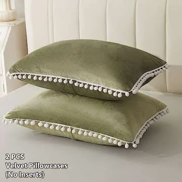 Show moreIf luxurious comfort and playful design are what you seek for your bedroom decor, look no further than the LIFEREVO Pom Poms Soft Velvet Pillow Cases Set of 2. Crafted from high-quality, silky soft velvet material, these sage green queen-size fuzzy bed pillowcases not only provide a gentle touch that is soothing against the skin but also elevate your bedding with their charming appearance. Each pillowcase is adorned with delightful white pom-poms that add a fun and whimsical flair to your sleep space, creating an inviting atmosphere that is perfect for relaxation or adding a pop of personality to your decor.