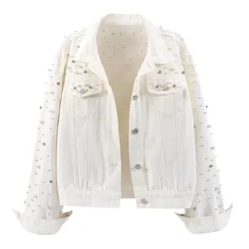 LifeShe Women's Pearls Denim Jacket Cropped Rhinestones Jean Jacket Coat