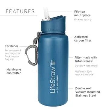 Show moreIntroducing the LifeStraw Go Stainless Steel Water Filter Bottle, the ultimate travel companion for adventurers, hikers, and anyone concerned about water quality. Crafted from durable stainless steel, this water bottle not only looks sleek but also features a highly efficient 2-Stage Integrated Filter Straw that meets stringent protocols established by the US Environmental Protection Agency (EPA) and NSF International/ANSI. With its double wall vacuum insulation, it maintains your drinks at the perfect temperature for up to 24 hours, making it ideal for both hot and cold beverages. Whether you're backpacking through the rugged terrains of Costa Rica or enjoying a serene hike in the mountains, this 24oz water bottle frees you from the worry of buying bottled water and its harmful impact on the environment, ensuring that your hydration needs are met safely and effectively.