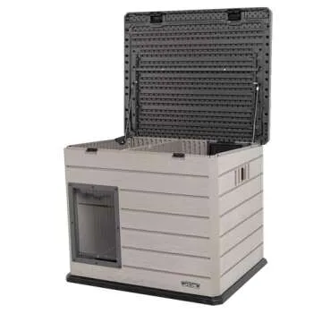 Show moreDiscover the ideal sanctuary for your cherished pets with the Lifetime Deluxe Dog House for Medium to Large Dogs. Crafted from premium high-density polyethylene (HDPE), this dog house is expertly designed to withstand the elements while providing a cozy retreat for your furry companions. Engineered with UV-resistant pigments and antioxidants, the structure promises remarkable durability and protection against sun damage, ensuring it remains a reliable haven for your pets throughout every season. Whether it’s sweltering summer days or chilly winter nights, this dog house offers a secure and comfortable environment for your beloved pets.