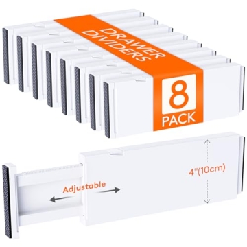 Show moreTransform your cluttered drawers into a haven of organization with the **Lifewit 8 Pack Drawer Dividers**. These innovative drawer organizers are designed to offer both versatility and efficiency, allowing you to effortlessly adapt to any drawer size. Measuring a height of **4 inches**, a width of **0.8 inches** and with an adjustable length ranging from **11 inches to 17.5 inches**, they ensure a snug and secure fit in all your drawers. Constructed from **high-quality ABS material**, these dividers are not only durable but also reliable. The EVA foam sponges at both ends prevent any scratches or damage to your drawer walls, maintaining the aesthetic look of your drawers while providing unmatched functionality. Plus, with patented technology (Patent No: US12133593B2), you can be assured that you’re purchasing a product designed to excel in the market.