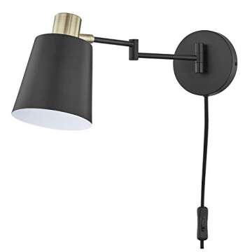 Light Society LS-W280-BK Alexi Plug-in Wall Sconce in Matte Black with Swivel Arm and Brass Details, Modern Contemporary Loft-Style Lighting