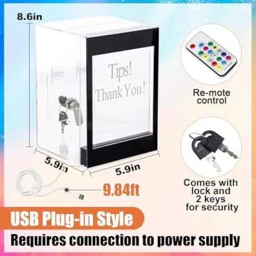 Light Up Acrylic Donation Ballot Box - 20 Colors Changing Tip Jar for Money with Re-mote, Lock, Key and Sign Holder- Raffle Suggestion Comment Vote Ticket Tip Box for Bartender Restaurant Band (USB)