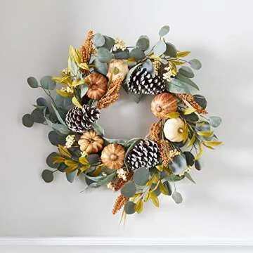 17.5" Fall Wreath - Artificial Eucalyptus, Pumpkin & Pinecone Decor