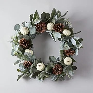Show moreWelcome the warmth of autumn into your home with the stunning Lights4fun, Inc. 19.5” Thanksgiving Fall Pumpkin, Eucalyptus & Pine Cone Wreath. Expertly handcrafted, this beautifully designed wreath showcases a delightful arrangement of fabric leaves and foliage artfully set upon a natural twig structure. It exudes a rustic charm that makes it perfect for enhancing the seasonal atmosphere of your home. The wreath boasts an inner diameter of 9 inches and an outer diameter of 19.5 inches, making it an ideal size for hanging on your front door or as a striking centerpiece on your dining table with candles placed artfully around it.