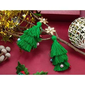 Lightweight Christmas Tree Tassel Beaded Earrings, Bohemian Dangle Drop Green Earrings, Twined with Colored Beads Earring for Women