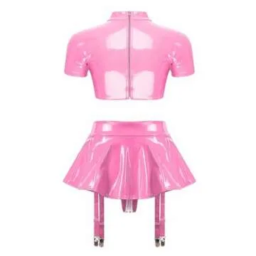 Paired with a stylish mini skirt, this outfit boasts adjustable garter belts with sturdy metal clips, ensuring your stockings stay firmly in place throughout the evening. The built-in thongs of the skirt provide added confidence, allowing you to dance the night away without the worry of any wardrobe malfunctions. The overall design not only highlights your curvy figure but also enhances your skin tone, making you look absolutely radiant when adorned in its glossy fabric.