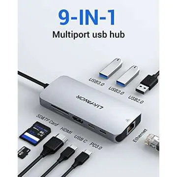 Show more Introducing the remarkable LIKFAVOR 9 in 1 USB-C Hub, a product designed specifically to enhance your digital experience. This versatile hub expands the capabilities of your MacBook Pro/Air or smartphone by transforming a single USB-C port into a myriad of useful interfaces. It features an HDMI port that delivers stunning 4K UHD visuals at 30Hz, enabling you to connect seamlessly to monitors, projectors, or TVs. Imagine enjoying your favorite movies or enhancing your gaming experience with vibrant, high-definition graphics. Additionally, this hub introduces a fast and efficient PD 3.0 charging port that can support up to 87W fast charging, ensuring that your devices are powered without delay.