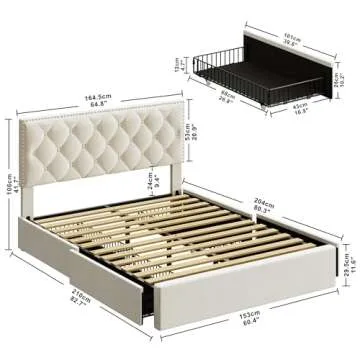 Show more Introducing the LIKIMIO Queen Bed Frame, a seamless blend of style, comfort, and functionality. Designed to elevate your bedroom experience, this bed frame features a sturdy construction with a heavy-duty metal frame and robust wooden slats, ensuring a solid foundation that can support up to 880 lbs. Whether you prefer a memory foam mattress or a traditional spring mattress, this frame provides the perfect platform without the need for a box spring.