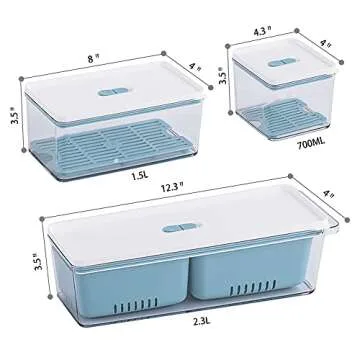 Show moreDiscover the ultimate solution for food storage with the Lille Home Stackable Produce Saver. Expertly crafted from high-quality, food-grade plastic, these containers are not only BPA-free but also designed to keep your food fresh without retaining unwanted flavors or odors. This versatile set of three containers features varying sizes to suit all your storage needs: a small 4.3x4x3.5 inch, a medium 8x4x3.5 inch with a removable drain tray, and a spacious large 12.3x4x3.5 inch equipped with two separate removable and drainable containers. These containers are perfect for any kitchen scenario, as they can be utilized in the refrigerator, freezer, and dishwasher, ensuring easy maintenance and convenience.