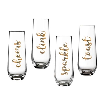 Show moreElevate your celebratory moments with the stunning Lillian Rose Gold Set of 4 Stemless Champagne Glasses. These beautifully designed flutes are not just drinkware; they are a statement piece for any occasion! Measuring 5.75 inches in diameter and holding up to 8 ounces of your favorite bubbly, they combine style and functionality seamlessly. Crafted from high-quality glass, these stemless flutes offer improved stability and ease of use compared to traditional stemmed flutes, making them ideal for toasting with friends or family. The charming metallic gold foil writing adds a touch of elegance, featuring delightful sayings like "clink", "sparkle", "toast", and "Cheers" โ perfect for any festive gathering.