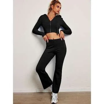 Show more This adorable two-piece knitted set is the ultimate addition to your winter wardrobe, designed to keep you cozy and stylish through the chilly months. Made from an ultra-soft stretchy ribbed knit fabric, this ensemble includes a matching cropped hoodie and flare-legged bottoms, providing a flattering silhouette for every body type. The hoodie features a charming ribbed design on the cuffs and waist, complete with adjustable drawstrings and a convenient zipped front, ensuring you can customize your fit comfortably.