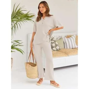 Show moreDiscover the effortless elegance of the LILLUSORY Lounge Sets for Women. This two-piece summer outfit is designed with the modern woman in mind, seamlessly blending comfort with style. Crafted from a premium, soft knit fabric, this set features an oversized crew neck top with a chic button design and a pair of high-rise, wide-leg pants that ensure a relaxed and flattering fit. Whether running errands or enjoying a casual dinner, this versatile ensemble can be dressed up or down with ease. Its breathable material makes it perfect for year-round wear, and its gentle sophistication ensures you’ll look put-together no matter the occasion.
